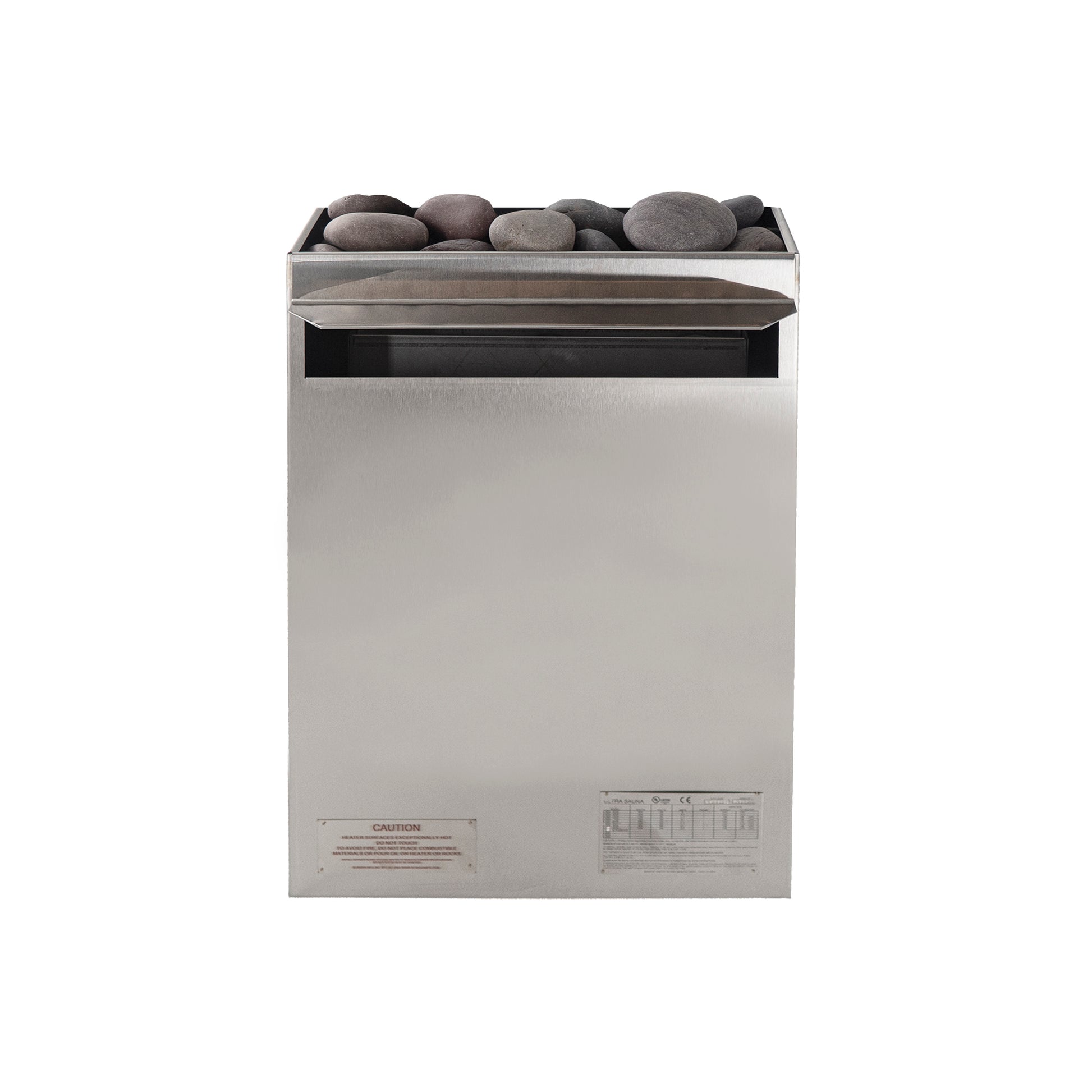 Scandia's traditional Finnish electric sauna heaters are designed for use in a cedar sauna room. The sleek, compact, and 100% stainless steel design creates a heater that’s as beautiful as it is functional. This small heater utilizes convection-style airflow and is a wall-mounted unit that is directly wired into the building. Includes elevated rock tray designed to prevent water application from damaging the unit. This small heater requires an electrical supply and includes all wire connections and supplied leads rated for high-temperature application.